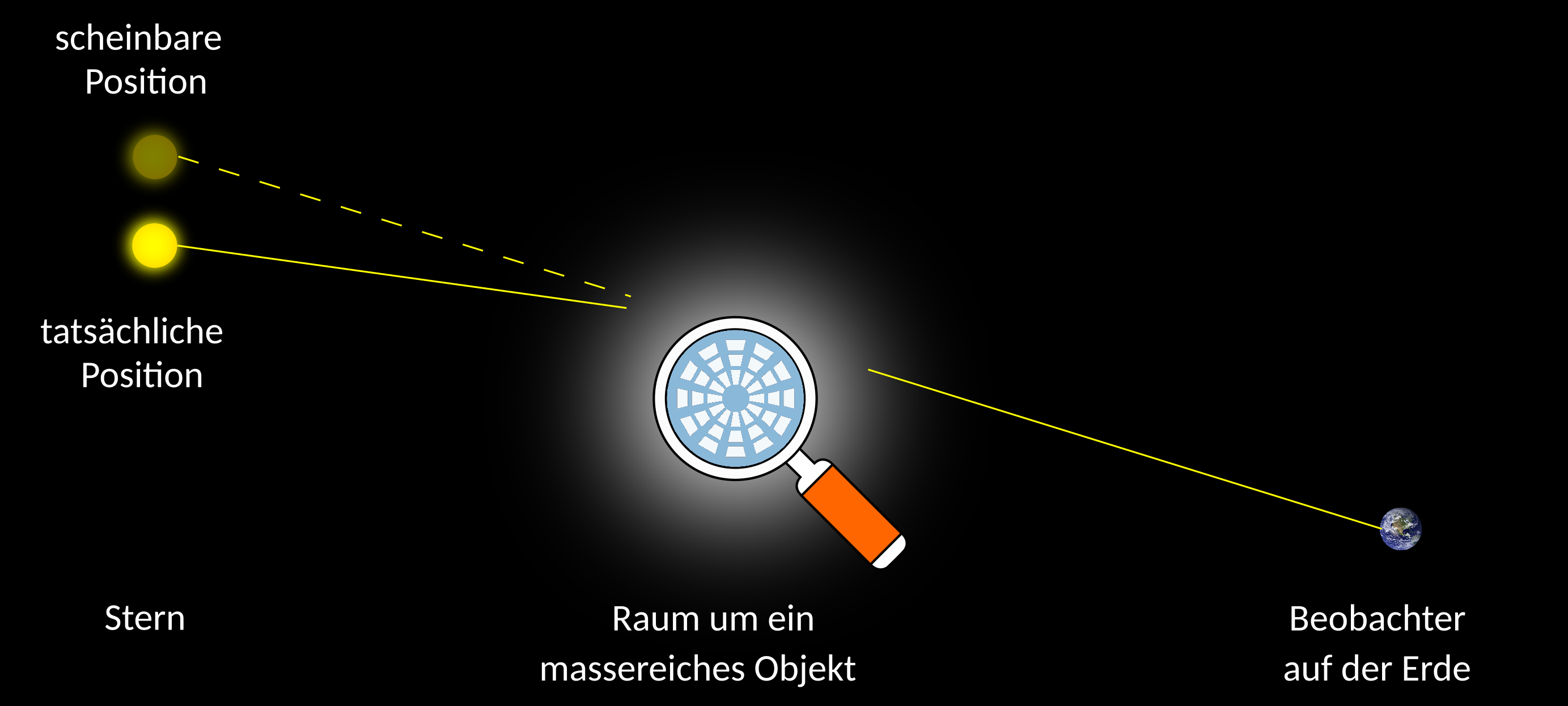 Licht breitet sich stets geradlinig aus. Wenn es einen Raum mit nicht-euklidischer Geometrie durchquert, hat es danach eine andere Richtung als vorher. Man spricht von Lichtablenkung.