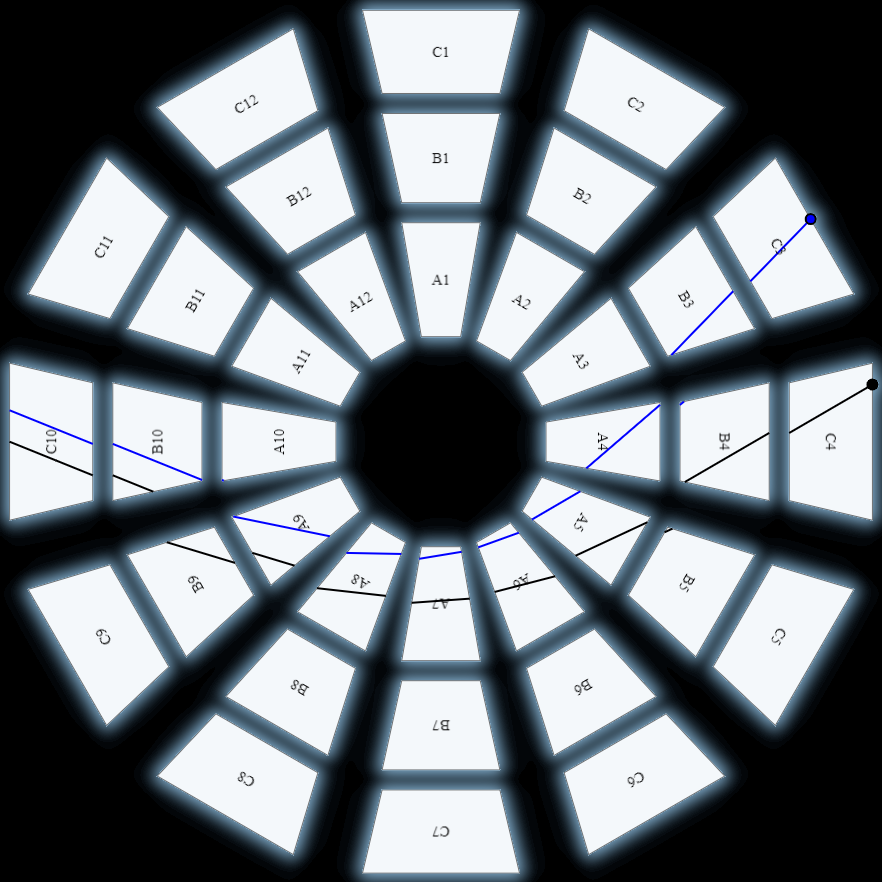 Doch was hat das mit Eddingtons Experiment zu tun? Hier spielt die Eigenschaft von Licht, dass es Geodäten folgt, eine zentrale Rolle. In unserem Beispiel haben wir Geodäten konstruiert, die den Bahnen von Licht sehr ähnlich sind. Wie wir feststellen konnten, verliefen unsere parallel startenden Geodäten zwar stets geradlinig über die Sektoren, zeigten jedoch später in unterschiedliche Richtungen.