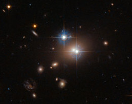 Solche Doppelbilder konnten in der Realität von Galaxien mit dem Hubble-Teleskop aufgenommen werden: