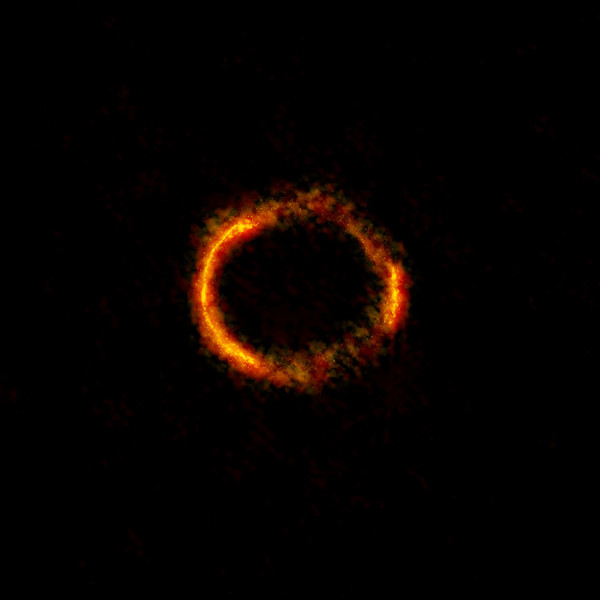 Befinden sich Lichtquelle, Schwarzes Loch und Beobachter auf einer Achse, dann kommt es zu einem ganz besonderen Phänomen: Da sich die Lichtstrahlen symmetrisch um das Schwarze Loch herum ausbreiten, sieht der Beobachter einen sogenannten Einsteinring. Wichtig ist, dass hierfür selbstverständlich nicht nur zwei Lichtstrahlen betrachtet werden müssen. Damit ein solches Bild entstehen kann, müssen Strahlen rund um das Schwarze Loch vom Beobachter gesehen werden können.